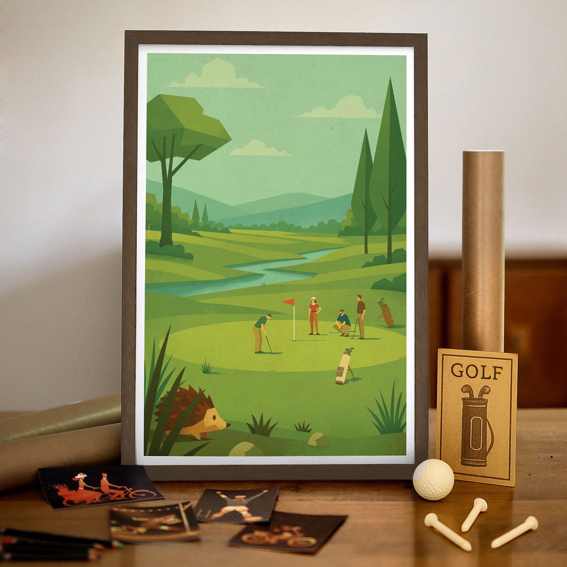 Plongez dans l’univers paisible du golf avec notre affiche vintage “Putting”, une illustration unique signée par un artiste issu du cinéma d’animation. Cette création capture toute la concentration et l’élégance du putting, dans un décor naturel rappelant les plus beaux parcours.